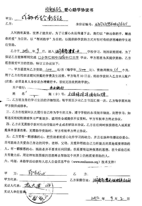 2012年12月12日,澧县一中校友总会收到了三份来自澧县一中成都校友会的爱心助学协议书。分别是由成都校友会会长彭吉银(1983届高831班)和副秘书长蔡华龙(1995届高923班)与母校的三名学弟学妹签订的爱心助学协议。