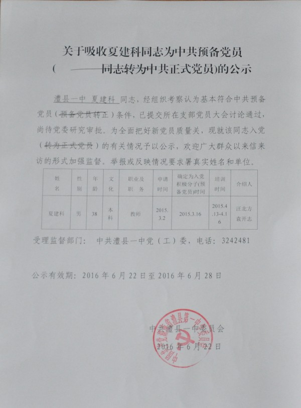 关于吸收陈飞宏、夏建科两位同志为中共预备党员的公示