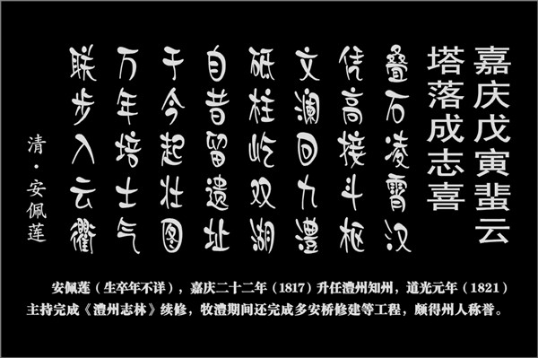 【安佩莲(生卒年不详),嘉庆二十二年(1817)升任澧州知州,道光元年(1821)主持完成《澧州志林》续修,牧澧期间还完成多安桥修建等工程,颇得州人称誉】