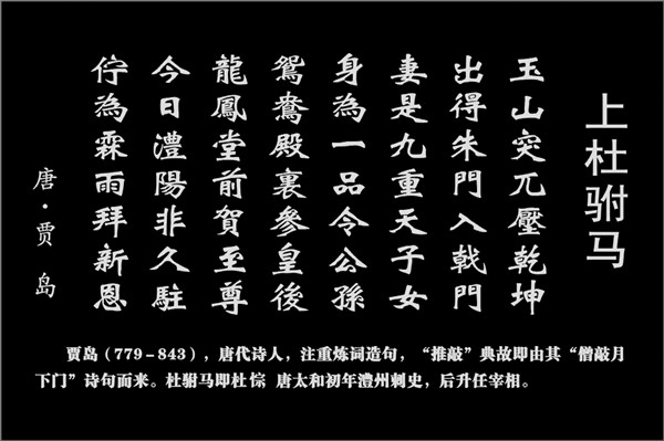 【贾岛(779-843),唐代诗人,注重炼词造句,“推敲”典故即由其“僧敲月下门”诗句而来。杜驸马即杜悰,唐太和初年澧州刺史,后升任宰相】