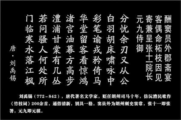 【刘禹锡(772-842),唐代著名文学家,贬任朗州司马十年,仿沅澧民歌作《竹枝词》200余首,通俗清新,别具一格。窦员外为朗州刺史窦常,张十一即张署,元九即元稹】