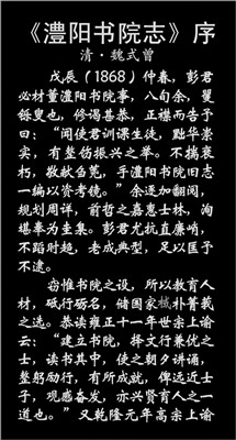 见,主讲者未及闻,毋乃徒慕虚名,弗求实践。余嘉彭君之意,因属其刷印规条若干帙,分布诸斋;添设斋长二人,以为督率;并于每月初吉①,偕学官宣讲圣谕广训二条,既提撕警觉②夫生徒,而有司③亦藉之修省,不敢徒以言教也。彭君以近日风气不古,拟增规条数事,补刊志中。余为之损益变通④,俾付剞劂⑤,愿多士循而习焉⑥,优而柔之⑦,阐明列圣谕设书院之深心,仰副皇上作人之雅化,学问必求根柢,经济发为文章,从此掇巍科,登显秩,由良儒而为良吏⑧。是因司牧者所厚望,抑亦彭君乐观闾里之荣者钦!(魏式曾,直隶临榆举人。清同治四年(1865)九月任澧州知州)