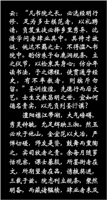 云:“凡书院之长,必选经明行修①、足为多士模范者,以礼聘请,负笈生徒②必择乡里秀异、沈潜学问者肄业其中。其恃才放诞、佻达不羁③之士,不得滥入书院中。酌仿朱子白鹿洞规条④,立之仪节⑤,以检束其身心;仿分年读书法,予之课程,使贯通乎经史,有不率教者,则摈斥勿留。”圣训煌煌,先德行而后文艺⑥。士生文教昌明之世,宜如何循名责实,以无负列圣訏谟⑦?