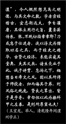 澧”,令人慨然想见禹之明德①,与其文命之敷②。学者穷经稽古,宜志期远大,争自濯磨,其体立用行之旨③,曩圣薪传朱、张,不既切指章章耶④?乃或急于仕进⑤者,徒以浮文为猎取功名之具,而于经史之精华,古贤之经济⑥,未能实窥其堂奥⑦,失其义矣。诸生受业于此,诚于讲贯、息游之下,缅想当日希文之风,因以其所得于师授者,归而诲其子弟,则风俗之纯庞,贤良之辈出,皆于是乎寄。幸勿但以此为操科甲之左券⑧,是则所厚望也夫!(王室龙,举人。清乾隆年间澧州学正。)