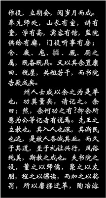 州人士咸以余之为是举也,功莫量矣,请记之。余曰:然,余何功之有?抑余所愿为公等记者有说焉。先王之立教也,其入人也深,其渐民也远⑨,是故人各诚其业。而久于其道,至于礼让兴行,风俗纯美,斯教之成也。夫书院之设,董之以师儒,聚之以友朋,程之以课读,而加之以奖罚,所以磨揉迁革⑩,陶冶溶