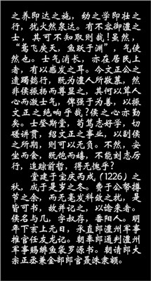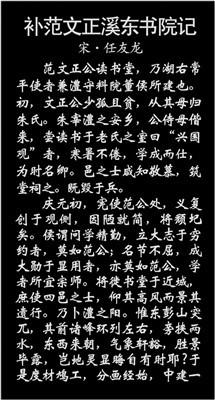 为不朽计,侯命友龙记之。友龙尝读国史,见文正之勋名事业铿鍧宇宙⑦,盖不特著见于参预大政之时,而实根本于穷居江湖之日。其言“先天下之忧而忧,后天下之乐而乐”,此志已定于素,故能入赞万机,出破西戎;而致我仁祖四十二年之盛治者,公之力也。噫!以文正公之立身行己,视先圣为无歉⑧,而建功立业,又书之青史而不愧。盖其穷