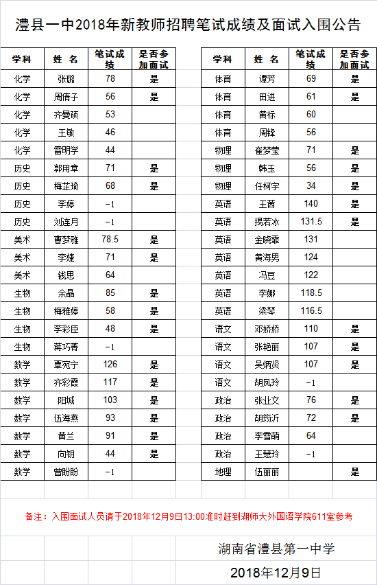 澧县第一中学2018年公开招聘教师笔试成绩及面试入围公告